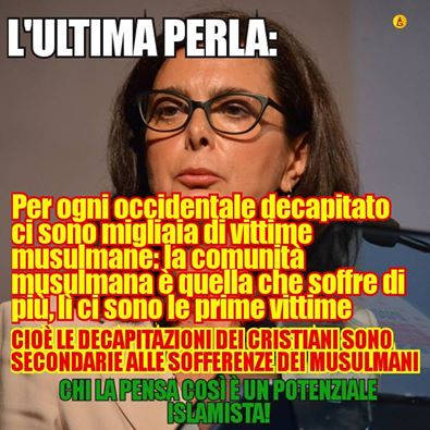 Chiarissimo che costei odia i cristiani…. E come ho già detto nel blog di Reflusso, se fosse stata la sua figliola ad esser stata decapitata, non parlerebbe così. Ma siamo alle solite: gli altri sono sempre sacrificabili alla causa del comunismo contro cristianesimo. E poi, la sua figliola ha la scorta! (pagata da noi ovviamente…).