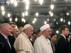 Un papa baciaculo islamico che entra in una moschea scalzo e prostrandosi ai piedi di quei fanatici di una religione assassina..