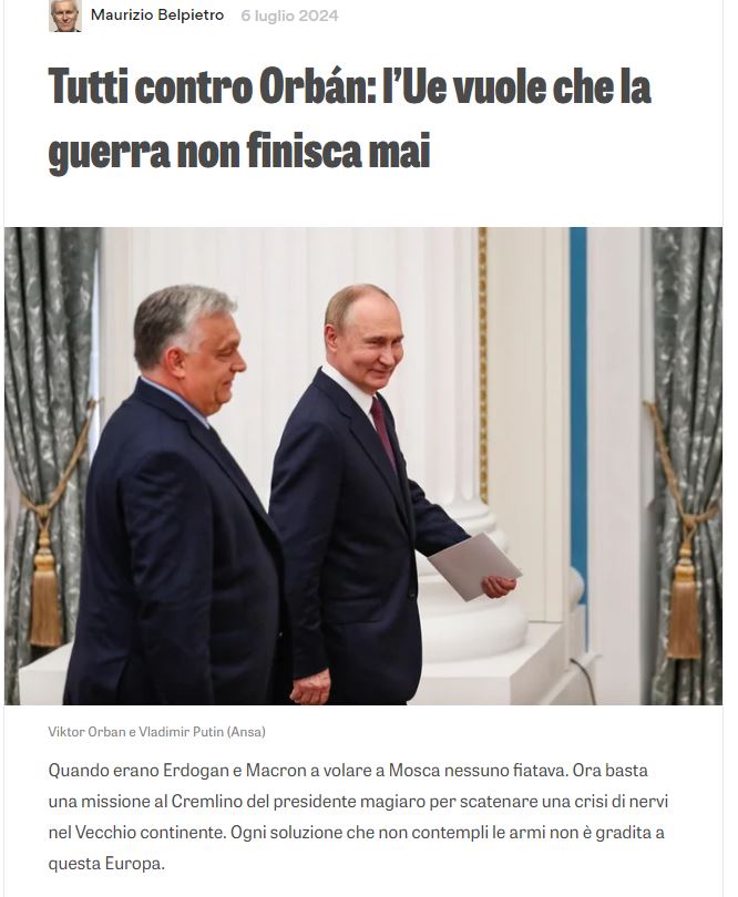CHISSENEFREGA SE NON HA MANDATO , SE RIESCE A COMBINARE QUALCOSA PER FAR TERMINARE LO STERMINIO !!! Orbán, missione da Putin. L’ira Ue: “Non può farlo” Il presidente di turno oggi a Mosca. Michel: “Non ha un mandato”. Martedì era stato da Zelensky Luigi Guelpa 5 Luglio 2024 – 06:00 ASCOLTA ORA Per la stampa unghereseContinua a leggere “maledetti …vogliono gestire solo loro la guerra sino all’infinito !!”