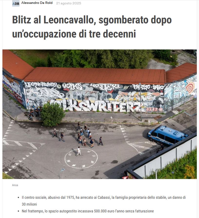 Leoncavallo, Zangrillo contro Lo Russo e Pd: “E Askatasuna? Miopia politica” Esplora: Sullo stesso argomento: 23 agosto 2025 Dopo 133 tentativi andati a vuoto, una lunga trattativa con il comune e decine di operazioni di resistenza, il Leoncavallo, storico centro sociale occupato di Milano, è stato sgomberato. Ha esultato il centrodestra, sempre dalla parte della legalità. CriticoContinua a leggere “i centri asociali che occupano immobili vanno sgombrati: TUTTI !”