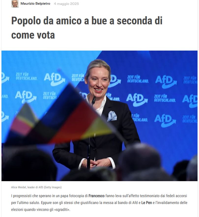 Giuseppe Conte, l’affondo di Sara Kelany: “All’estero nessuno ti rimpiange” lunedì 5 maggio 2025condividi 2′ di lettura “Dopo la stampa francese, anche quella tedesca ha dovuto riconoscere gli straordinari meriti del Governo Meloni. Sono passati oltre due anni dal suono della campanella a Palazzo Chigi e i gufi che invocavano il governo tecnico di lì a poche settimane oggiContinua a leggere “qui invece solo i parassiti fancazzisti del reddito rimpiangono il marchese del grullo”