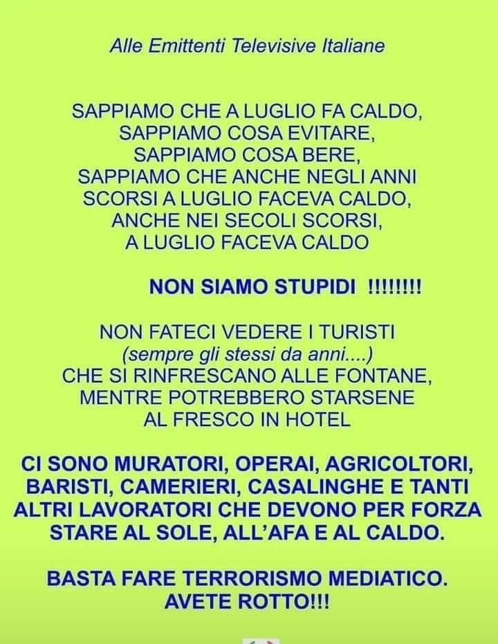 L’aria che tira, delirio del giornalista inglese: “Il grande caldo? Per colpa della Meloni…” Esplora: Sullo stesso argomento: L’aria che tira, delirio del giornalista inglese: “Il grande caldo? Per colpa della Meloni…” 00:00 C’è qualcuno che segue la teoria di Angelo Bonelli, ossia che la colpa di tutto questo caldo sia di Giorgia Meloni. Accade a L’Aria CheContinua a leggere “se le teste di cazzo volassero sarebbe sempre buio !”