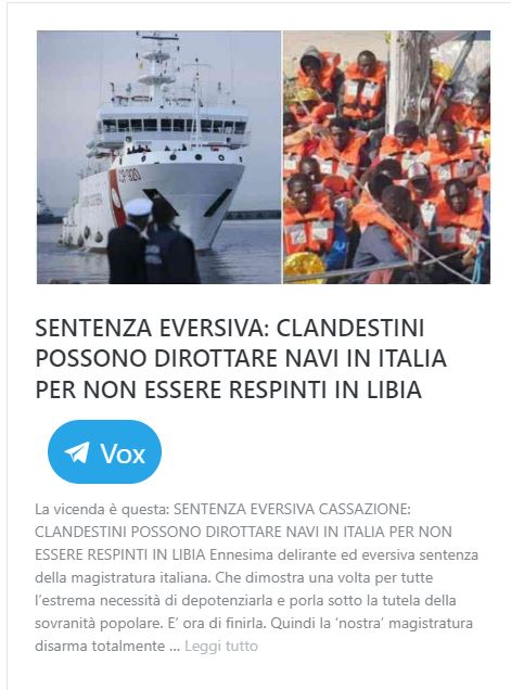IMMIGRATI ARMATI DIROTTANO NAVE, PER I MAGISTRATI NON È REATO: “CAUSA DI FORZA MAGGIORE” GIUGNO 9, 2023 VOX 1 COMMENTO Vox Per la nave dirottata dal solito branco di clandestini armati: https://voxnews.info/2023/06/09/immigrati-armati-sequestrano-nave-e-la-portano-in-italia/embed/#?secret=nfxzBzTDOa Dobbiamo ringraziare le solite toghe ideologicamente corrotte: https://voxnews.info/2022/04/27/sentenza-eversiva-clandestini-possono-dirottare-navi-in-italia-per-non-essere-respinti-in-libia/embed/#?secret=NPbuOIkpVV Sanno che, male che vada, finiranno in hotel.