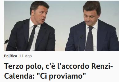 Quando Calenda attaccava Renzi: “Mi fa orrore, mai alleato con lui” 11 Agosto 2022 – 16:03 “Non farò un’alleanza con Renzi, l’ho detto seimila volte”. “Il suo modo di fare politica mi fa orrore”. Così parlava in tv Carlo Calenda. E Forza Italia rilancia il video che lo imbarazza Marco Leardi COME SI FA A VOTARE SIFFATTI SOGGETTI ?