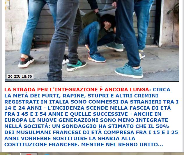 IUS SCHOLAE, SALVINI: VOGLIONO DARE LA CITTADINANZA ALLE BABY GANG LUGLIO 2, 2022 VOX LASCIA UN COMMENTO BREAKING NEWS, INVASIONE, POLITICA LETTA E SPERANZA: “LEGISLATURA NON FINIRÀ PRIMA APPROVAZIONE IUS SCHOLAE” LUGLIO 1, 2022 VOX LASCIA UN COMMENTO BREAKING NEWS, ESTERI, VIDEO LIBIA, MANIFESTANTI BRUCIANO IL PARLAMENTO: NOI PENSIAMO ALL’UCRAINA – VIDEO LUGLIO 1, 2022 VOX LASCIA UN COMMENTO BREAKING NEWS, INVASIONE ONG FRANCESE RIFIUTA TARANTO:Continua a leggere “con simili idioti è giusto che scompariamo !!”