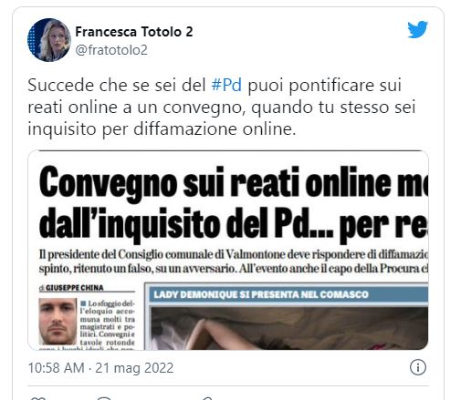 “Dobbiamo aiutare l’Ucraina a difendersi. La Cina è il pericolo più grave” 21 Maggio 2022 – 14:29 Dalla guerra in Ucraina al pericolo cinese, passando per le responsabilità dell’Europa. Pubblichiamo il discorso integrale tenuto da Berlusconi alla convention di Forza Italia a Napoli Silvio Berlusconi CHE PENA…..CHI NON CAPISCE QUANDO E’ ORA DI SMETTERE FINISCE NEI MARASMI MENTALI ED E’Continua a leggere “rincoglionimento senile”
