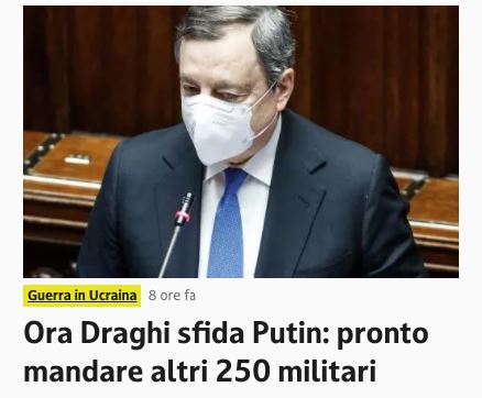 Mario Draghi, Ucraina o Covid? Alessandro Sallusti: no, la guerra la sta perdendo in Puglia Alessandro Sallusti 23 marzo 2022 Certo la guerra in Ucraina, dopo il Covid, sta frenando la crescita economica e quindi lo sviluppo del Paese. Ma è come se piovesse sul bagnato perché da tempo immemore in Italia, contro crescita e sviluppo,Continua a leggere “gli effetti dell’ammucchiata:”