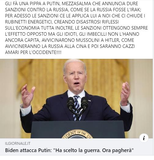 RESTA IL FATTO CHE RIEMPIRSI DI BASI NATO STANDO INCOLLATI ALLA RUSSIA NON E’ STATA UNA MOSSA NE’ INTELLIGENTE NE’ FURBA :ORA POI COME IL MARITO CHE SI TAGLIA LE PALLE PER FAR DISPETTO ALLA MOGLIE MINACCIAMO “SANZIONI” QUANDO SIAMO TOTALMENTE DIPENDENTI DAGLI ALTRI…. GIOVA RICORDARE CHE I SINISTRI OBAMA/BIDEN HANNO DIMOSTRATO D’AMARE LA GUERRAContinua a leggere “premesso che a casa sua ognuno dovrebbe fare quel che vuole….”
