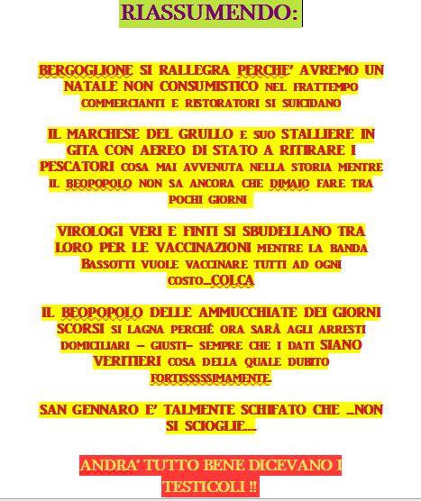 Giovanni Brambilla PICCOLI PENSIERINI PER CHI ….. CHI SI LAMENTA CONTRO LE CHIUSURE NON CE LA FA A CAPIRE CHE E’ “MERITO” DI COLORO CHE SI SONO AMMASSATI COME BEOTI NEI GIORNI SCORSI. CHI SI LAMENTA PER IL NATALE BLINDATO NON CE LA FA A CAPIRE CHE MEGLIO BLINDATI VIVI CHE LIBERI MORTI CHI SIContinua a leggere “pensierini incazzosi:”